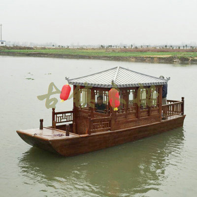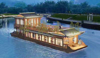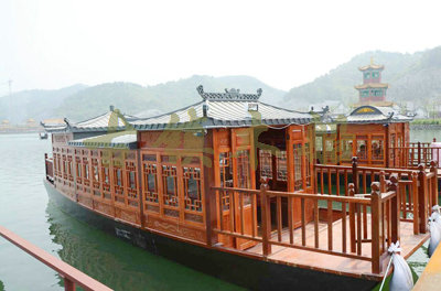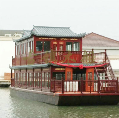 畫舫船就是裝飾古典華麗的游船,是"中國(guó)風(fēng)"的仿古游船,結(jié)合古典園林建筑,體現(xiàn)了中華文明的古典藝術(shù).畫舫船豪華而又古典,船上的建筑按照中國(guó)古代建筑里的亭臺(tái)樓閣,建筑工藝之復(fù)雜,要求之嚴(yán)格,仿古畫舫游船的特點(diǎn)飛檐翹角、玲瓏精致的四角亭子逐漸成形,赫然立于船頭,美人靠、盤龍柱子、彩畫……龍柱上的浮雕盤龍和祥云一層扣著一層,層層錯(cuò)落有致,雕刻精細(xì)到盤龍身上的每一個(gè)鱗片都細(xì)細(xì)可數(shù),古代皇家標(biāo)志性元素,在畫舫船上體現(xiàn)的淋漓盡致。除了雕刻、花窗,整條船還有一個(gè)看點(diǎn),那就是弧線優(yōu)美、高高翹起的船尾。游船并不大,長(zhǎng)約10米、寬3米,但是整體看起來(lái)堪稱一件藝術(shù)品。船尾的雕花欄桿與船艙、船頭的雕刻遙相呼應(yīng),船身四周貼著浮雕祥云,給整條船增添了富貴、華麗的氣質(zhì)。